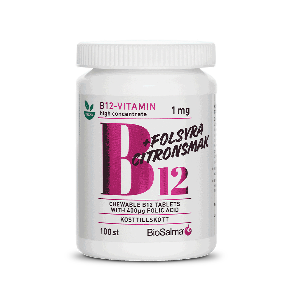 Vitamin B12 finns främst i animaliska livsmedel. Som vegan kan man därför behöva ett extra tillskott av vitamin B12. Vår B12-vitamin är en tuggtablett/sugtablett med citronsmak och innehåller vitamin B12 och folsyra.