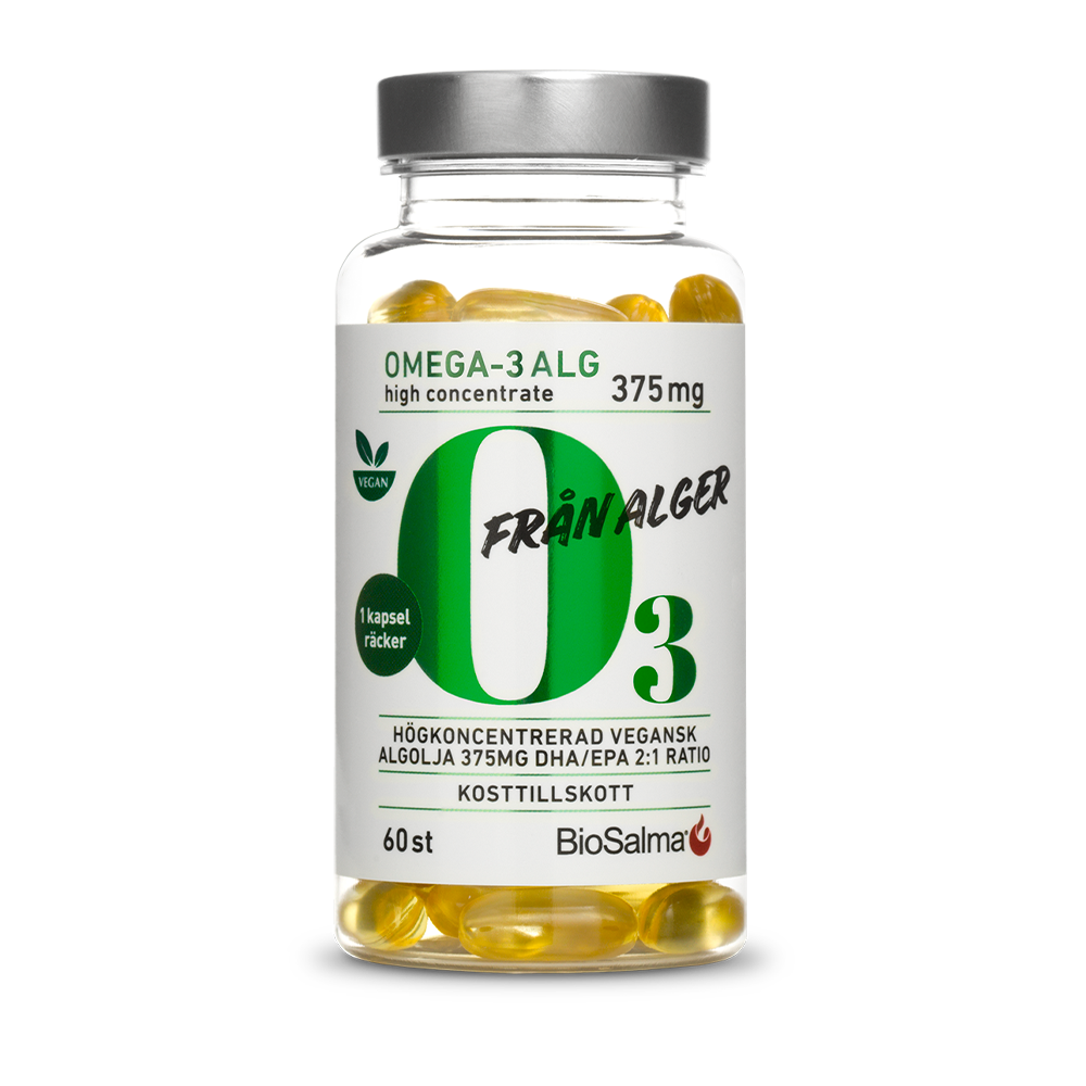 Alger är det naturliga ursprunget till de essentiella fettsyrorna DHA och EPA, en hållbar källa till de viktiga Omega-3-fettsyrorna. En kapsel räcker för att nå den nivå av EPA och DHA som bidrar till gynnsam effekt för hjärta, hjärnan och synens normala funktion.