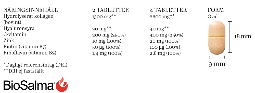 I Biosalma Collagen + Hyaluronsyra har vi kombinerat utvalda näringsämnen som har funktion för din hud och dina leder. Tabletterna innehåller bland annat C-vitamin, biotin, riboflavin och zink som alla bidrar till upprätthållandet av normalt fungerande hud. C-vitamin bidrar också till normal kollagenbildning vilket ger skelettet, blodkärl och leder dess normala funktion.