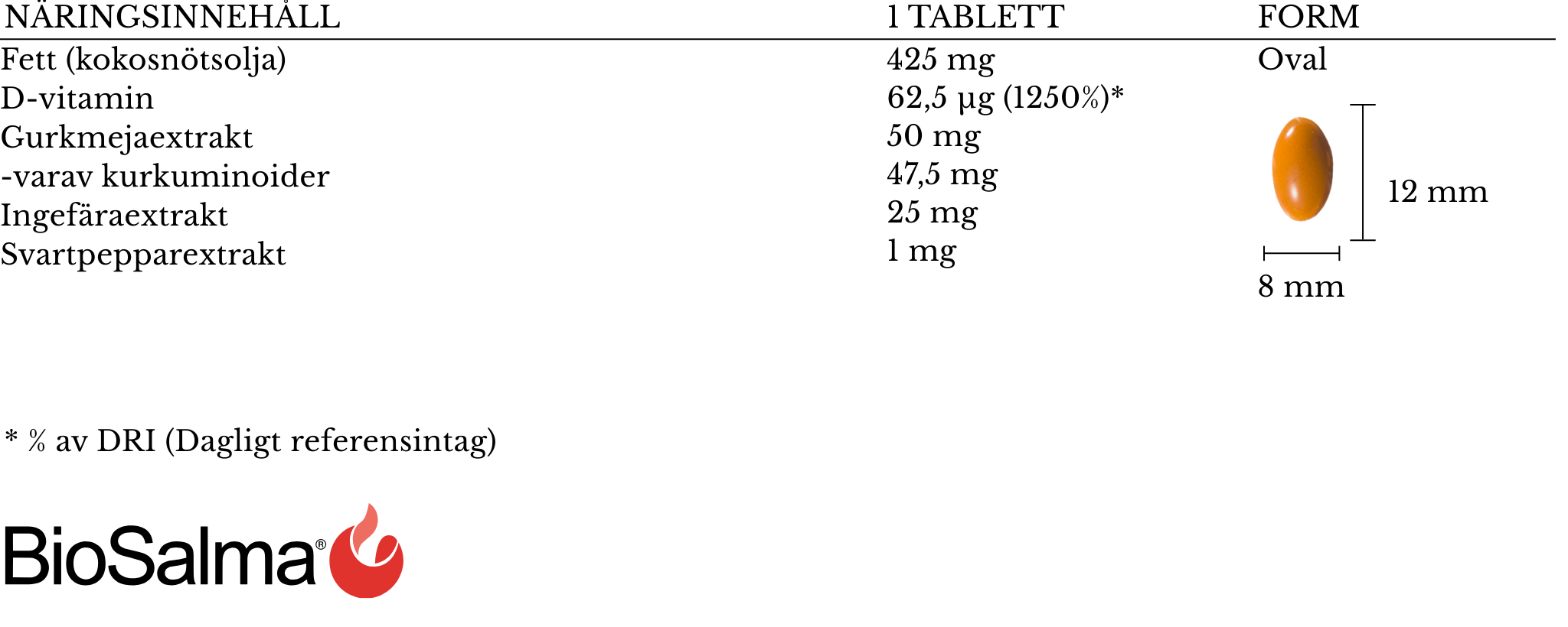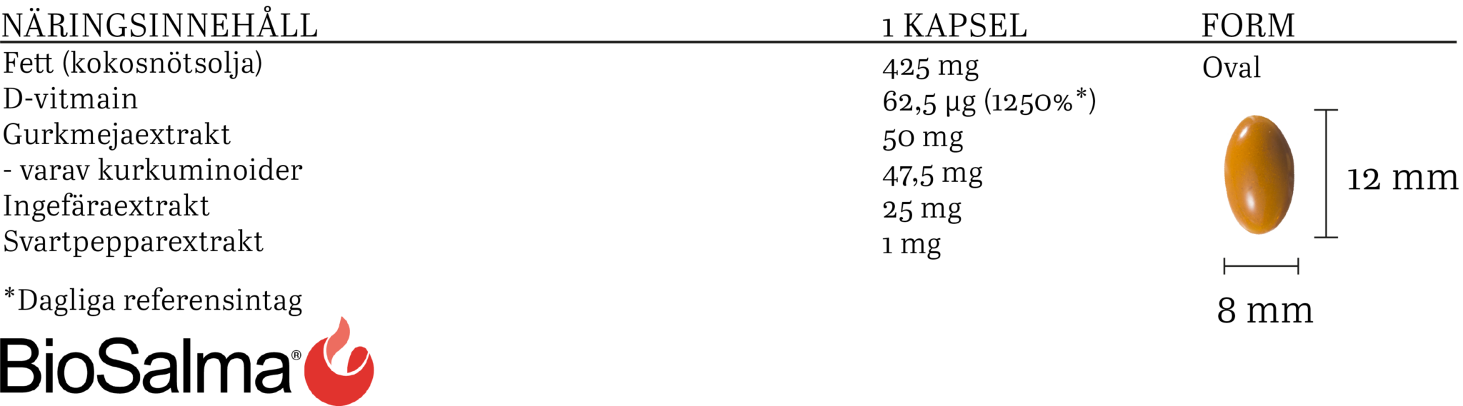 I vår högkoncentrerade D3-vitamin (62,5μg) med gurkmejaextrakt och ingefäraextrakt har vi använt det patenterade gurkmejaextraktet (C3 complex®). Koncentratet innehåller hela 95% cucuminoider och har använts i flera vetenskapliga artiklar som påvisat cucuminoidernas effekt i kroppen.