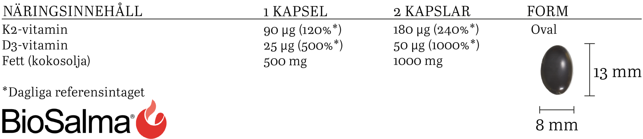 K2-vitamin och D3-vitamin är fettlösliga vitaminer och vi har valt att lösa dem i kokosolja för bästa förutsättningar för upptag. Båda vitaminerna bidrar till en normal benstomme och tillsammans har de visat sig förstärka varandras effekt. K2-vitamin är också nödvändig för att blodet ska koagulera på rätt sätt. Vi använder (menakinon-7) som råvara i vårt K2-tillskott, det är denna variant som har använts i en mängd vetenskapliga studier som visar effekten av tillskottet. Den som tar blodförtunnande medel bör rådgöra med sin läkare innan användning av K2-vitamin.