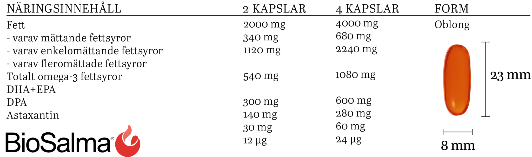 Bara ren och naturlig laxolja! I vårt kosttillskott Omega-3 Salmon Oil är laxoljan helt naturlig och oförändrad. Genom en mild process utvinns oljan från färsk norsk lax och innehåller de unika näringsämnen som finns i laxen. Bland annat naturliga fosfolipider och antioxidanten astaxanthin som också ger oljan sin vackra rödorangea färg. Här hittar du såklart Omega-3-fettsyrorna EPA och DHA. Tillsammans stärker de ditt hjärtas normala funktion. Många bra saker i en enda kapsel.