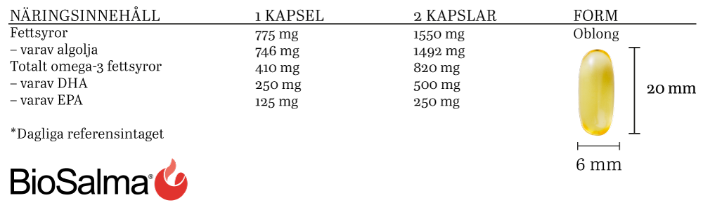 BioSalma Omega-3 av alg är ett kosttillskott med 375mg DHA/EPA per kapsel. Algerna som används odlas i slutna kontrollerade system för att kunna garantera innehåll och funktion. DHA bidrar till ögats och hjärnans utveckling hos foster och ammande barn. (Den gynnsamma effekten uppnås vid ett dagligt intag av 200 mg DHA hos modern utöver det rekommenderade dagliga intaget för omega-3-fettsyror för vuxna, dvs 200 mg DHA + 250 mg DHA/EPA.)