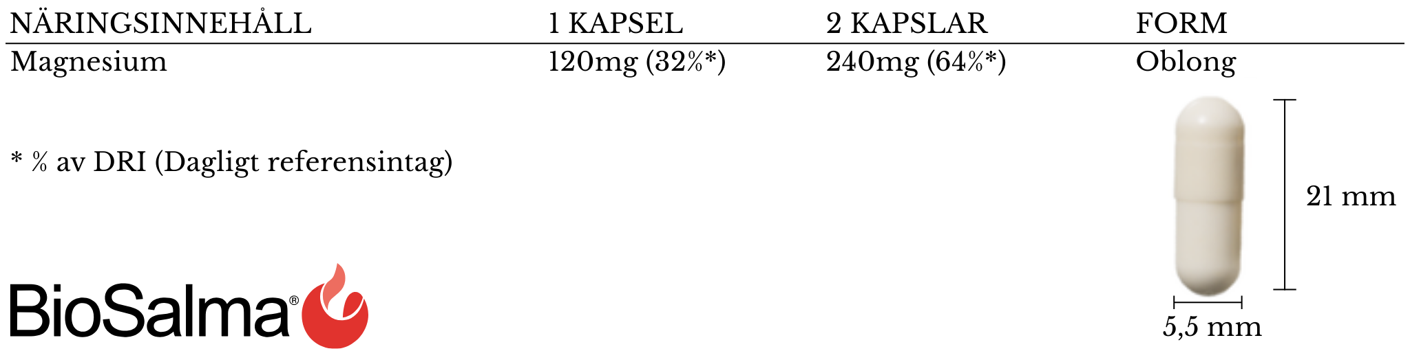 BioSalma Organiskt Magnesium är ett kosttillskott med tre lättupptagliga former av magnesium: magnesiumbisglycinat, magnesium-malat och magnesium-laktat. Dessa organiska magnesiumföreningar är kända för sin goda biotillgänglighet och lämpar sig väl för dagligt intag.