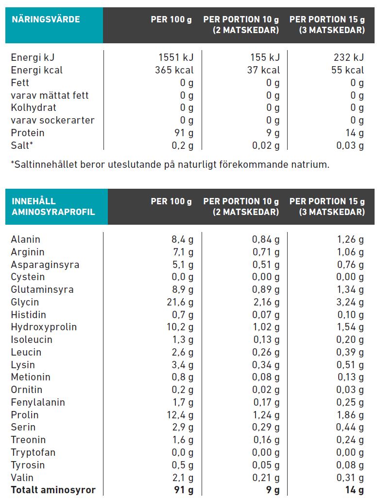 Hydrolyserade kollagenpeptider. Ursprung kollagen: Bovine (Nötkreatur).