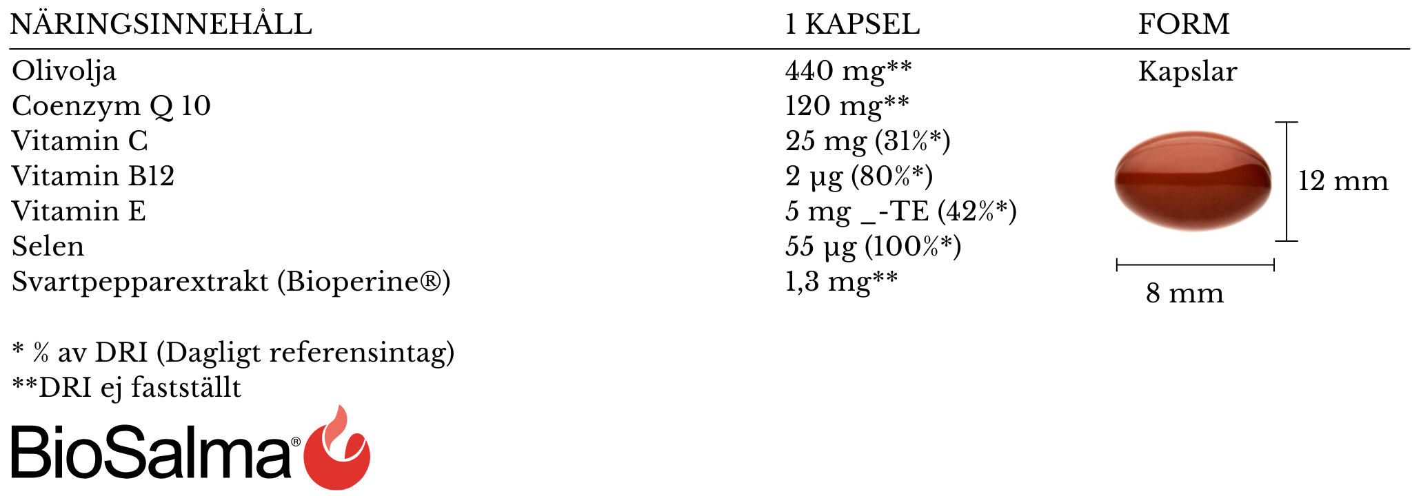 BioSalma® Q10 + selen är ett kosttillskott som bland annat innehåller ämnen för att skydda kroppens celler mot oxidativ stress såsom C, E-vitamin samt selen. Produkten innehåller också Coenzymet ubikinon även känt som Q10 samt vitamin B12 för att bidra till minskad trötthet och utmattning.