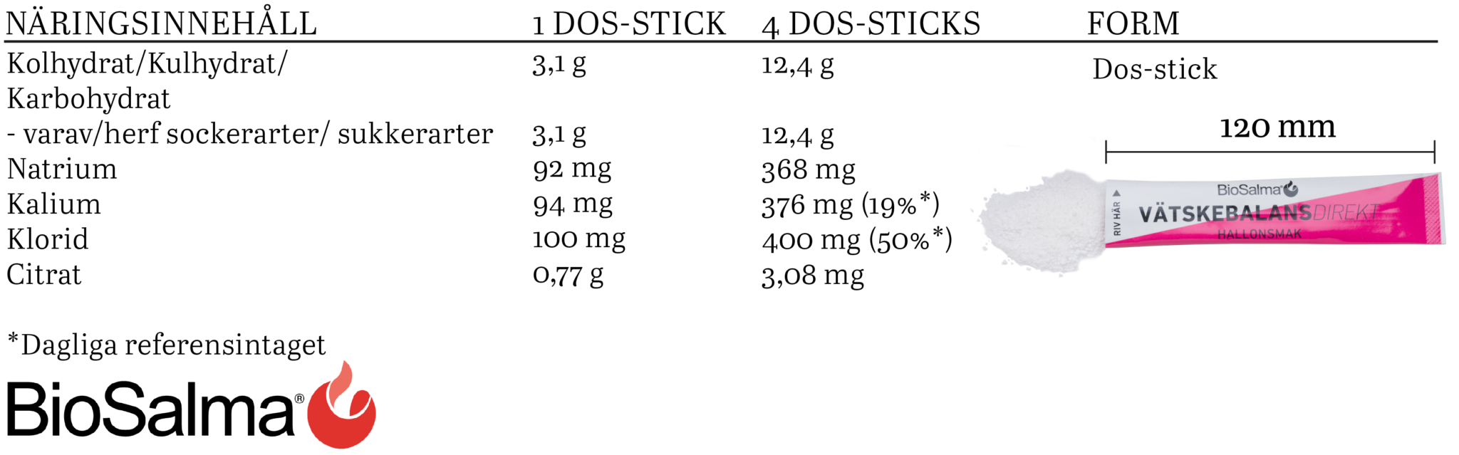 BioSalma® Vätskebalans Direkt med hallonsmak är ett kosttillskott som tillför vätska och salter. Pulvret med de aktiva ingredienserna är förpackade i dos-sticks och löser sig på ca 30 sekunder i vatten, vilket gör att du snabbt kan dricka vätskeersättningen när du behöver.